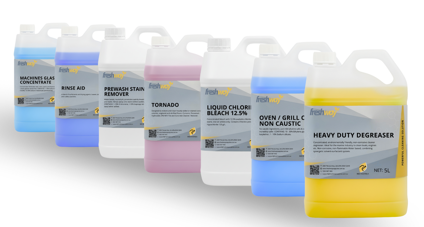 Explore a trusted range of Freshway professional cleaning chemicals, developed for commercial, institutional and industrial environments where performance matters. From everyday maintenance cleaners to specialised and heavy-duty solutions, Freshway products are formulated for reliability, efficiency and consistent results across a wide range of cleaning applications.