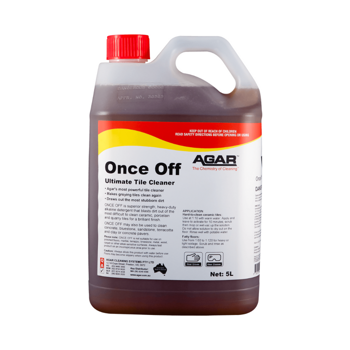 Agar Once Off is a high-alkaline, heavy-duty tile cleaner formulated to restore and refresh even the most heavily soiled surfaces. Ideal for deep cleaning tiled floors and hard surfaces, it cuts through grease, grime, and embedded dirt in one go—reducing labour and delivering outstanding results with minimal effort.