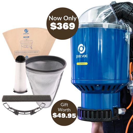 Elevate your commercial cleaning operations with the Pacvac Superpro 700 Backpack Vacuum, the trusted choice of professional cleaners across Australia. This commercial-grade cleaning powerhouse features a robust 1000W motor, advanced HEPA-rated Hypercone™ filtration system, and ergonomic Ecoharness design, delivering consistent high-performance results in demanding high-traffic environments.